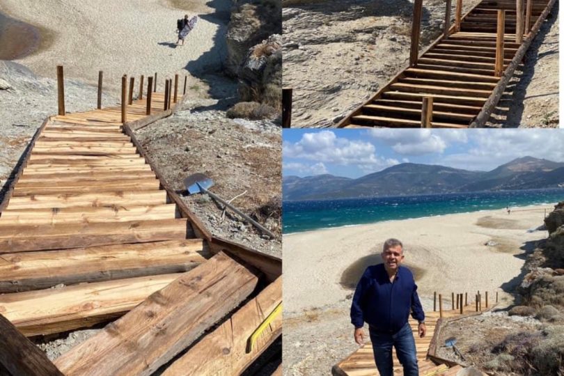 Ο Δήμος Καρύστου προχώρησε άμεσα στις απαραίτητες παρεμβάσεις με την κατασκευή ξύλινων σκαλοπατιών ώστε η παραλία να είναι πλέον εύκολα προσεγγίσιμη και να μπορούν όλοι οι επισκέπτες να χαρούν τα καταγάλανα νερά της.