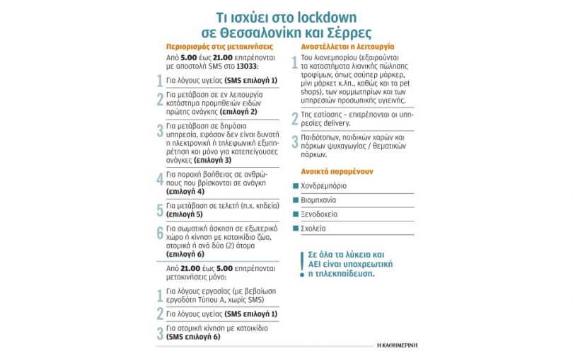 «Μοντέλο Θεσσαλονίκης» με κανονικό lockdown και επαναφορά των sms, όπως είχε αποκαλύψει η «Κ» από την περασμένη εβδομάδα, είναι το σχέδιο της κυβέρνησης για όλη τη χώρα, εάν τα νέα μέτρα που θα εφαρμοστούν από σήμερα το πρωί σε όλη την επικράτεια δεν αποδώσουν. Χθες ο κυβερνητικός εκπρόσωπος Στ. Πέτσας ανακοίνωσε την επιβολή lockdown σε Θεσσαλονίκη και Σέρρες από σήμερα τα ξημερώματα. Αυτό πρακτικά σημαίνει πως στις δύο περιοχές της Βορείου Ελλάδος θα επιτρέπεται η μετακίνηση μόνο με την αποστολή sms, ενώ η μόνη διαφορά με το lockdown της περασμένης άνοιξης είναι πως θα παραμείνουν ανοικτά τα σχολεία, εκτός από τα λύκεια που θα λειτουργήσουν με τηλεκπαίδευση, όπως και τα ΑΕΙ. Ανοικτά θα είναι τα μαγαζιά που έχουν να κάνουν με πρώτες ανάγκες, όπως είναι τα φαρμακεία, τα βενζινάδικα, τα σούπερ μάρκετ, οι φούρνοι και τα κρεοπωλεία και όσα καταστήματα έχουν να κάνουν με τρόφιμα. Η μετακίνηση μάλιστα με sms θα επιτρέπεται έως τις 9 το βράδυ, καθώς θα ισχύει απαγόρευση κυκλοφορίας έως την 5η πρωινή. Αυτό το διάστημα θα επιτρέπονται οι μετακινήσεις μόνο για λόγους εργασίας και υγείας.