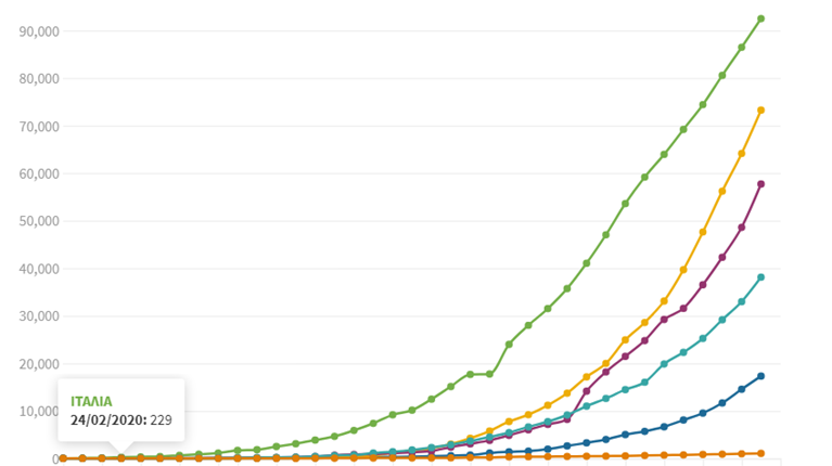 Σε σύγκριση με την Ιταλία, την Ελβετία, την Ισπανία, τη Γαλλία, τη Μεγάλη Βρετανία και τη Γερμανία, η Ελλάδα βρίσκεται στην τελευταία θέση στον αριθμό των κρουσμάτων (περίπου 1000 κρούσματα) τις πρώτες 32 ημέρες εμφάνισης του κορονοϊού στη χώρα μας.
