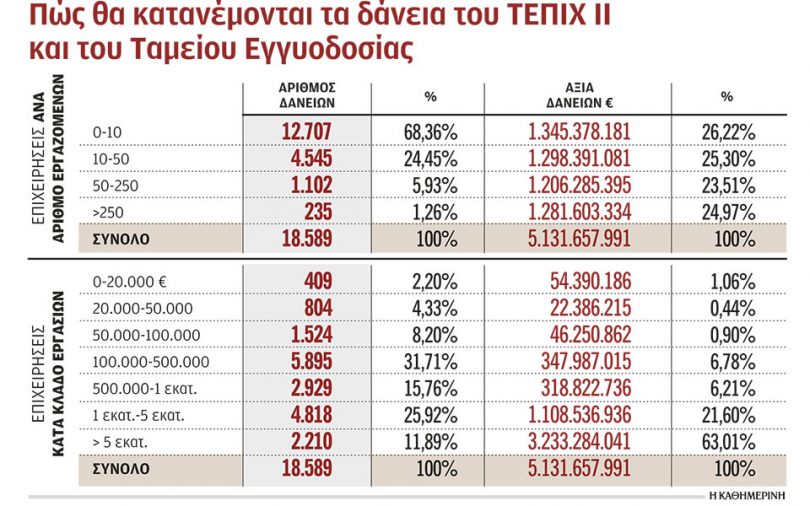 Τον κατακερματισμό του ελληνικού επιχειρείν σε πολύ μικρές επιχειρήσεις με χαμηλή παραγωγικότητα και περιορισμένη πρόσβαση στον τραπεζικό δανεισμό, αποτυπώνουν τα στοιχεία για την κατανομή των δανείων που δόθηκαν μέσω των προγραμμάτων ΤΕΠΙΧ ΙΙ και Ταμείο Εγγυοδοσίας της Ελληνικής Αναπτυξιακής Τράπεζας.