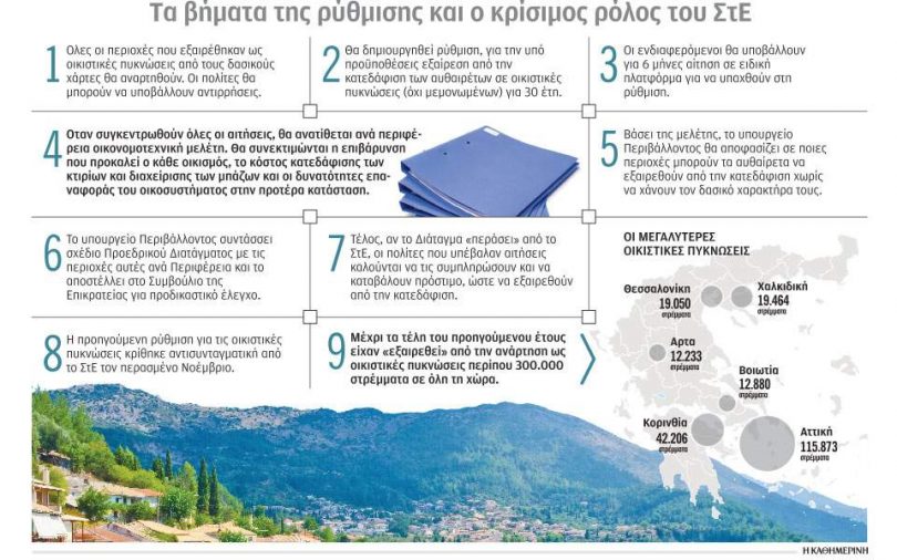 H δυνατότητα τακτοποίησης αυθαιρέτων σε δάση για 30 έτη μετά την εκπόνηση οικονομοτεχνικής μελέτης, μέσω ενός πλαισίου που θα καταρτίζεται ανά ομάδες περιοχών και θα προεγκρίνεται από το Συμβούλιο της Επικρατείας, είναι η πρόταση του υπουργείου Περιβάλλοντος για τις οικιστικές πυκνώσεις. Κύριος στόχος του υπουργείου είναι να μην έχει η νέα ρύθμιση την τύχη της προηγούμενης, η οποία ακυρώθηκε από το Συμβούλιο της Επικρατείας ως αντισυνταγματική. Ως δείγμα συμμόρφωσης με την απόφαση, το υπουργείο «θα αναρτήσει τις περιοχές» που εξαιρέθηκαν προσωρινά από τον δασικό χάρτη όντας μέσα στα όρια οικιστικών πυκνώσεων.