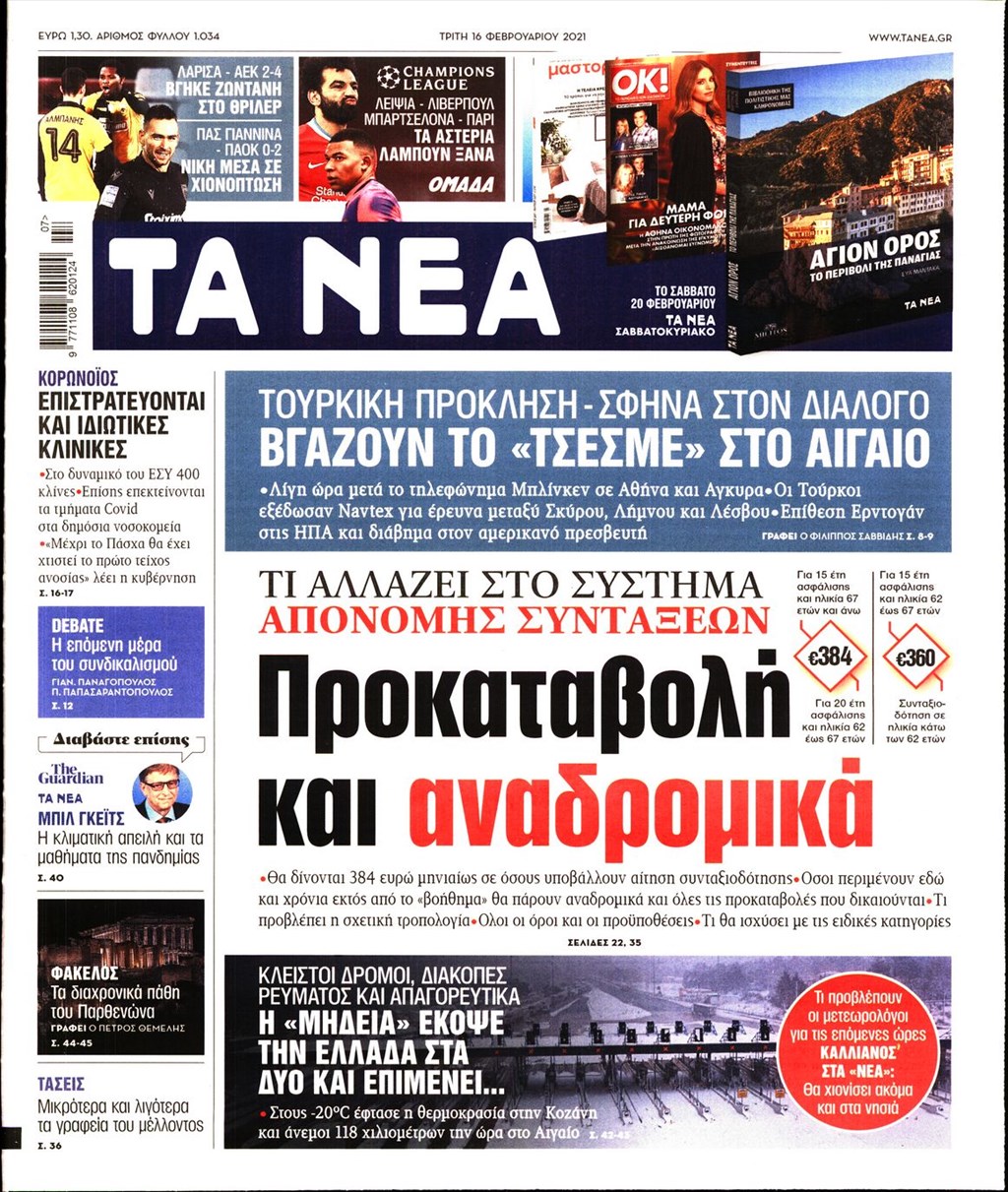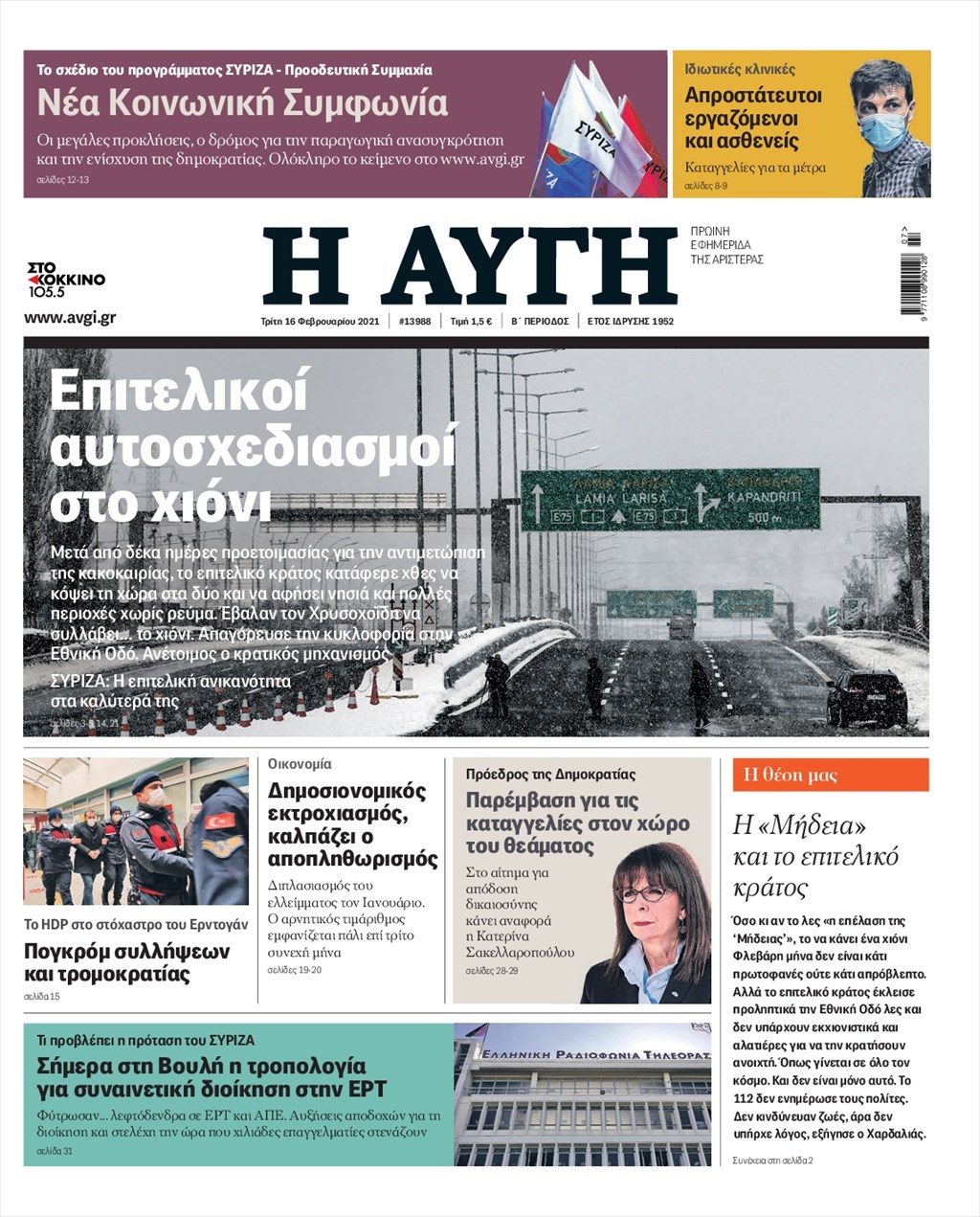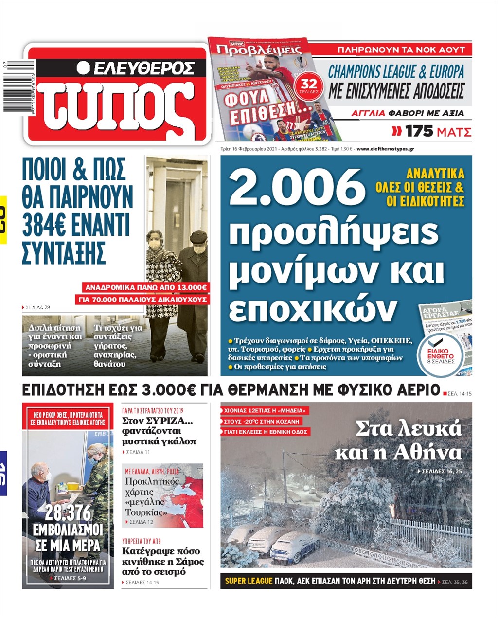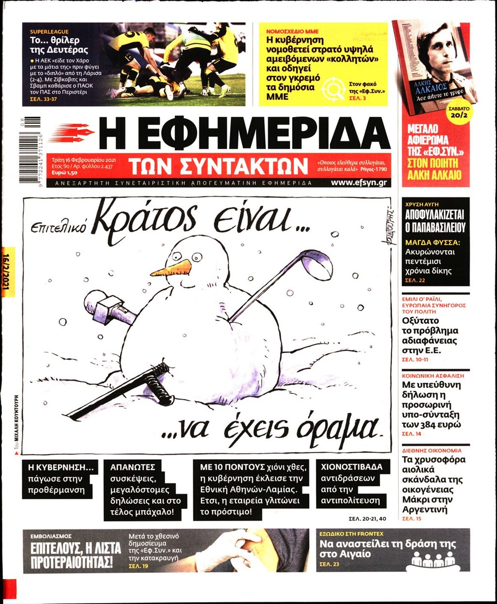 Τα πρωτοσέλιδα των εφημερίδων 16 Φεβρουαρίου