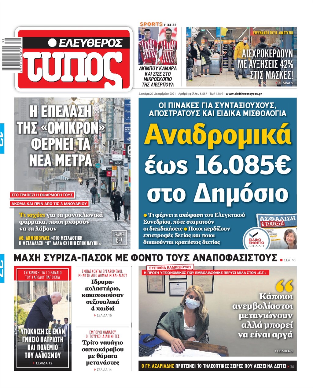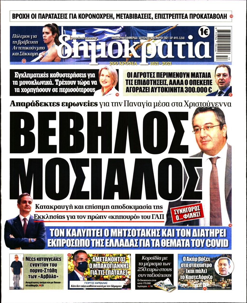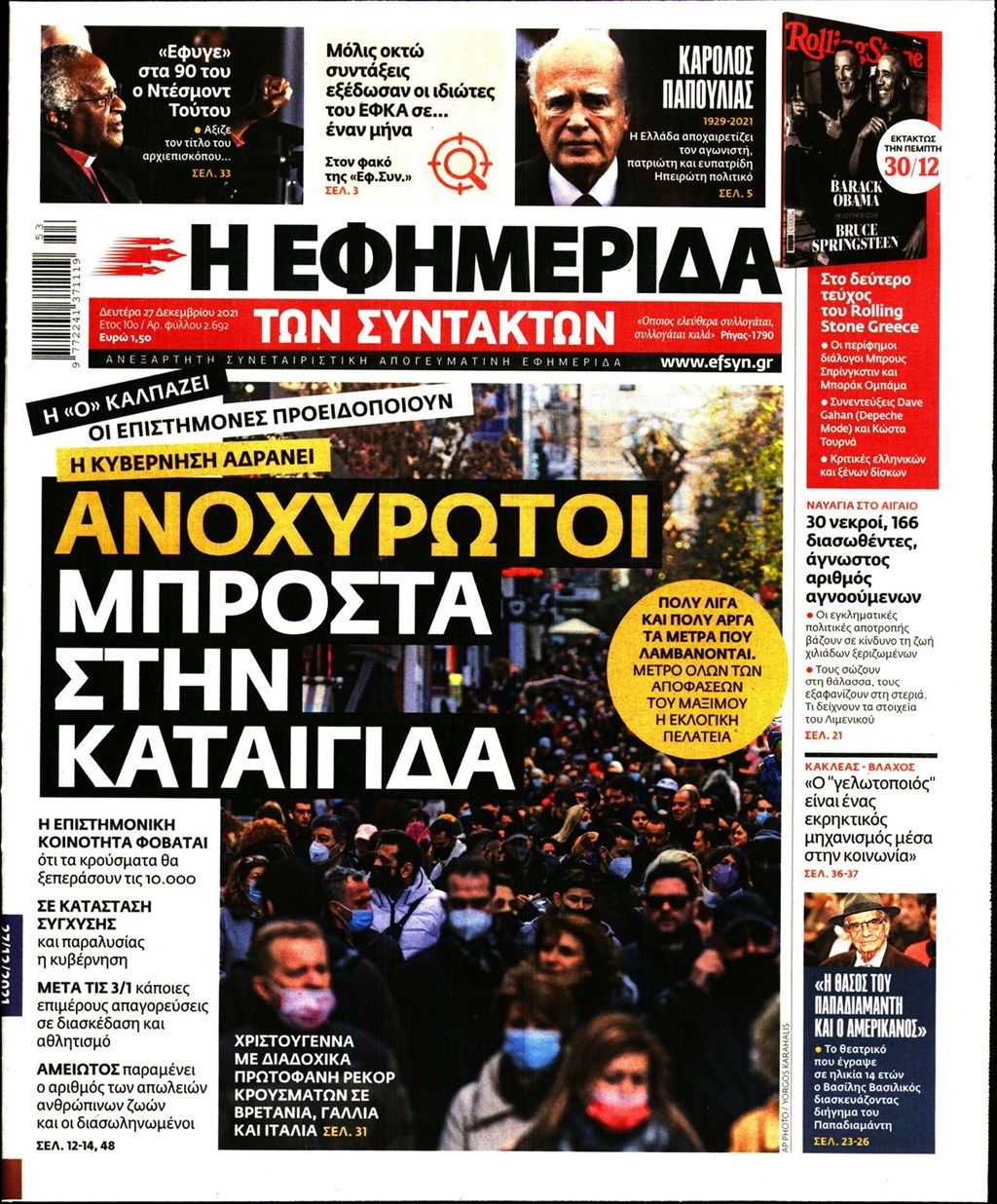 Τα πρωτοσέλιδα των εφημερίδων 27 Δεκεμβρίου