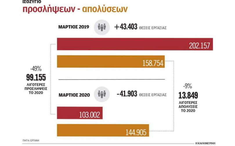 Είναι χαρακτηριστικό, όπως αναφέρεται και στο μηνιαίο δελτίο του πληροφοριακού συστήματος «Εργάνη», ότι από τη σύγκριση των στοιχείων των δύο μηνών, Μαρτίου 2020 και Μαρτίου 2019, προκύπτει αρνητική επίδοση κατά 85.276 λιγότερες θέσεις εργασίας για τον Μάρτιο 2020 (αρνητικό ισοζύγιο -41.903 θέσεων εργασίας έναντι θετικού ισοζυγίου +43.403 τον Μάρτιο του 2019). Μάλιστα, τα στοιχεία εκτιμάται ότι θα ήταν ακόμη πιο ανησυχητικά εάν τα μέτρα που έλαβε η κυβέρνηση δεν συνοδεύονταν από τη ρητή υποχρέωση των επιχειρήσεων που εντάχθηκαν σε αυτά να διατηρήσουν τις υφιστάμενες θέσεις εργασίας και να μην προχωρήσουν σε απολύσεις.