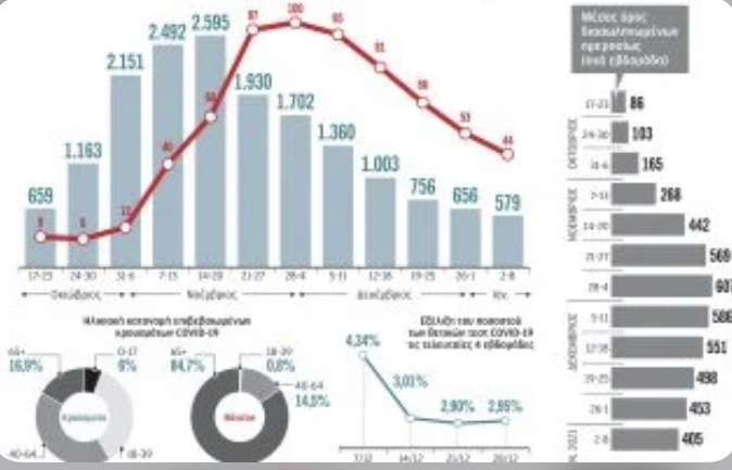 Στην Ελλάδα, η οποία έως τώρα είχε ως σύμμαχο τις υψηλές θερμοκρασίες, μετά δύο μήνες lockdown το ΕΣΥ είναι καταπονημένο και παραμένει πιεσμένο, ενώ ακόμα δεν έχει αποτυπωθεί η χαλαρότητα των γιορτών στην εξέλιξη της πανδημίας. Αν και ο αριθμός των κρουσμάτων έχει πέσει στα επίπεδα που ήταν στις 20 Οκτωβρίου, ο ημερήσιος αριθμός των θανάτων και των διασωληνωμένων ασθενών με COVID-19 παραμένει υπερδιπλάσιος από τον αντίστοιχο που ήταν την ημέρα που αποφασίστηκε η εφαρμογή του lockdown (179 διασωληνωμένοι ασθενείς και 18 θάνατοι καταγράφηκαν στις 4 Νοεμβρίου, 386 και 49 αντίστοιχα την Παρασκευή 8 Ιανουαρίου). Ο δε μεγάλος φόβος όλων είναι το πώς εξελίσσεται η πανδημία στην Αττική των 3,8 εκατομμυρίων μόνιμων κατοίκων, όπου ήδη σε κάποιες περιοχές, μεταξύ των οποίων και το κέντρο της Αθήνας, διαφαίνεται σχετική αύξηση των κρουσμάτων.