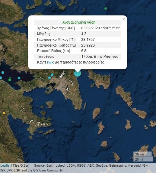 Σεισμός σημειώθηκε κοντά στην Ραφήνα και έγινε ιδιαίτερα αισθητός στην Αττική. Σύμφωνα με το Γεωδυναμικό Ινστιτούτο, ο σεισμός ήταν 4,3 Ρίχτερ και το εστιακό βάθος ήταν 6,8 χιλιόμετρα. Το επίκεντρο του σεισμού εντοπίζεται στα 17 χιλιόμετρα βόρεια βορειοανατολικά της Ραφήνας.