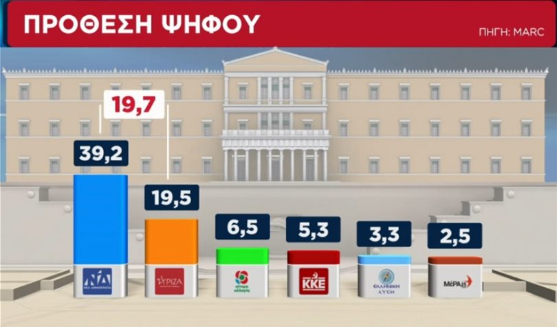 Στο ερώτημα «τι θα ψηφίζατε εάν είχαμε εκλογές αύριο» η ΝΔ συγκέντρωσε το 39,2%, ο ΣΥΡΙΖΑ το 19,5%, το ΚΙΝΑΛ 6,5%, το ΚΚΕ 5,3%, η Ελληνική Λύση το 3,3% και 2,5% το ΜέΡΑ 25.