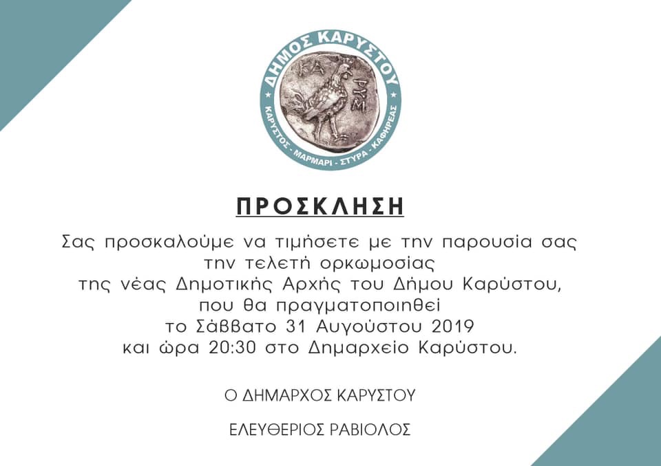Πρόσκληση στην Τελετή Ορκομωσίας της νέας Δημοτικής Αρχής του Δήμου Καρύστου αύριο στις 20.30
