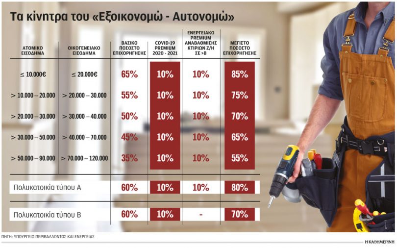 Τα μεγαλύτερα κονδύλια ωστόσο θα κατευθυνθούν στην αναβάθμιση κατοικιών μέσω ενός διευρυμένου προγράμματος ο σχεδιασμός του οποίου συνδυάζει τις κλασικές παρεμβάσεις ενεργειακής εξοικονόμησης με παρεμβάσεις που ενισχύουν την αυτονόμηση των κατοικιών, όπως έξυπνα συστήματα διαχείρισης, παραγωγή και αποθήκευση ηλεκτρικής ενέργειας από ΑΠΕ και σταθμοί φόρτισης ηλεκτρικών οχημάτων. Το νέο πρόγραμμα «Εξοικονομώ – Αυτονομώ» προβλέπει διεύρυνση εισοδηματικών κριτηρίων σε σχέση με το προηγούμενο πρόγραμμα, δηλαδή το «Εξοικονομώ κατ’ οίκον», υψηλότερα ποσοστά επιδοτήσεων, αλλά και επιπρόσθετα κίνητρα όπως την COVID-19 premium, δηλαδή αυξημένη κατά 10% επιδότηση για τα έτη 2020-2021. Για τους 10 δήμους της χώρας που επηρεάζονται από την απολιγνιτοποίηση προβλέπεται πρόσθετη επιδότησης της τάξης του 10%. Συνολικά η επιδότηση για χαμηλά εισοδήματα μπορεί να φτάσει μέχρι και 85% ή και 95% για νοικοκυριά που βρίσκονται στις λιγνιτικές περιοχές. Μια άλλη νέα παράμετρος που εντάσσεται στο νέο πρόγραμμα είναι οι παρεμβάσεις αναβάθμισης των κοινόχρηστων χώρων πολυκατοικίας, δηλαδή κουφώματα κοινόχρηστων χώρων, πόρτες εισόδου κ.λπ. Το βασικό ποσοστό επιδότησης για τις παρεμβάσεις σε πολυκατοικίες είναι ανεξάρτητο από το εισόδημα των ιδιοκτητών (60%) και μπορεί να φτάσει με τις προσαυξήσεις έως και 90%.