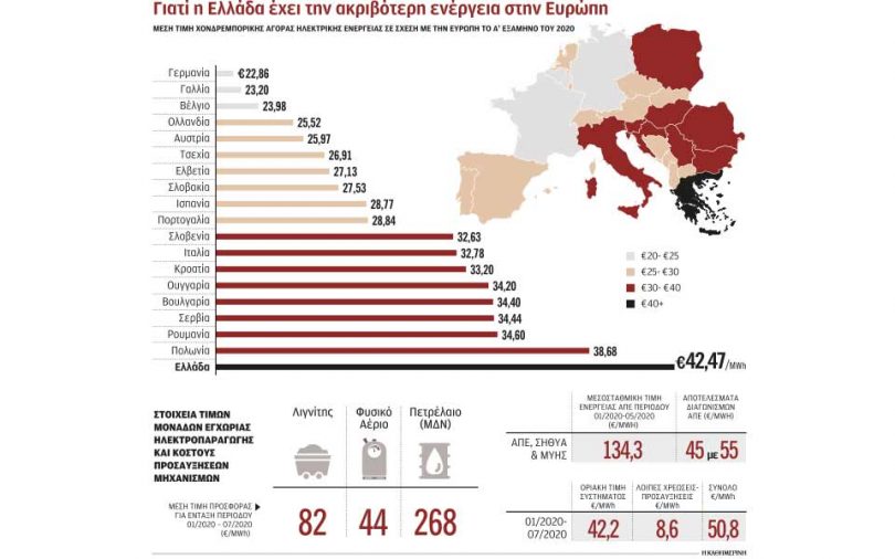 Τέλος στο ενεργειακό Ελντοράντο για λίγους εις βάρος των πολλών και της εθνικής οικονομίας δείχνει αποφασισμένο να βάλει το υπουργείο Περιβάλλοντος και Ενέργειας, εισάγοντας ύστερα από 8 χρόνια αλλεπάλληλων αναβολών ένα ανταγωνιστικό μοντέλο διαμόρφωσης τιμών του ηλεκτρικού ρεύματος. Η Ελλάδα έχει την υψηλότερη –και με διαφορά– τιμή χονδρεμπορικής αγοράς ηλεκτρικής ενέργειας στην Ευρώπη. Στο πρώτο εξάμηνο του 2020 διαμορφώθηκε στα 42,47 ευρώ η μεγαβατώρα, περί τα 8 με 10 ευρώ πάνω από τις γειτονικές χώρες των Βαλκανίων και την Ιταλία (32-34 ευρώ η μεγαβατώρα) και σχεδόν 20 ευρώ πάνω από τη Γερμανία και το Βέλγιο, που εμφανίζουν τις χαμηλότερες τιμές (22,86 και 23,98 ευρώ η μεγαβατώρα αντίστοιχα). Η θλιβερή αυτή πρωτιά είναι αποτέλεσμα δομικών χαρακτηριστικών της ελληνικής αγοράς και θεσμοθετημένων στρεβλώσεων, το κόστος των οποίων καταβάλλουν οι καταναλωτές – νοικοκυριά και βιομηχανία. Για την τελευταία, το ενεργειακό κόστος είναι ίσως το κυριότερο μειονέκτημα έναντι των ανταγωνιστών της στις ξένες αγορές.