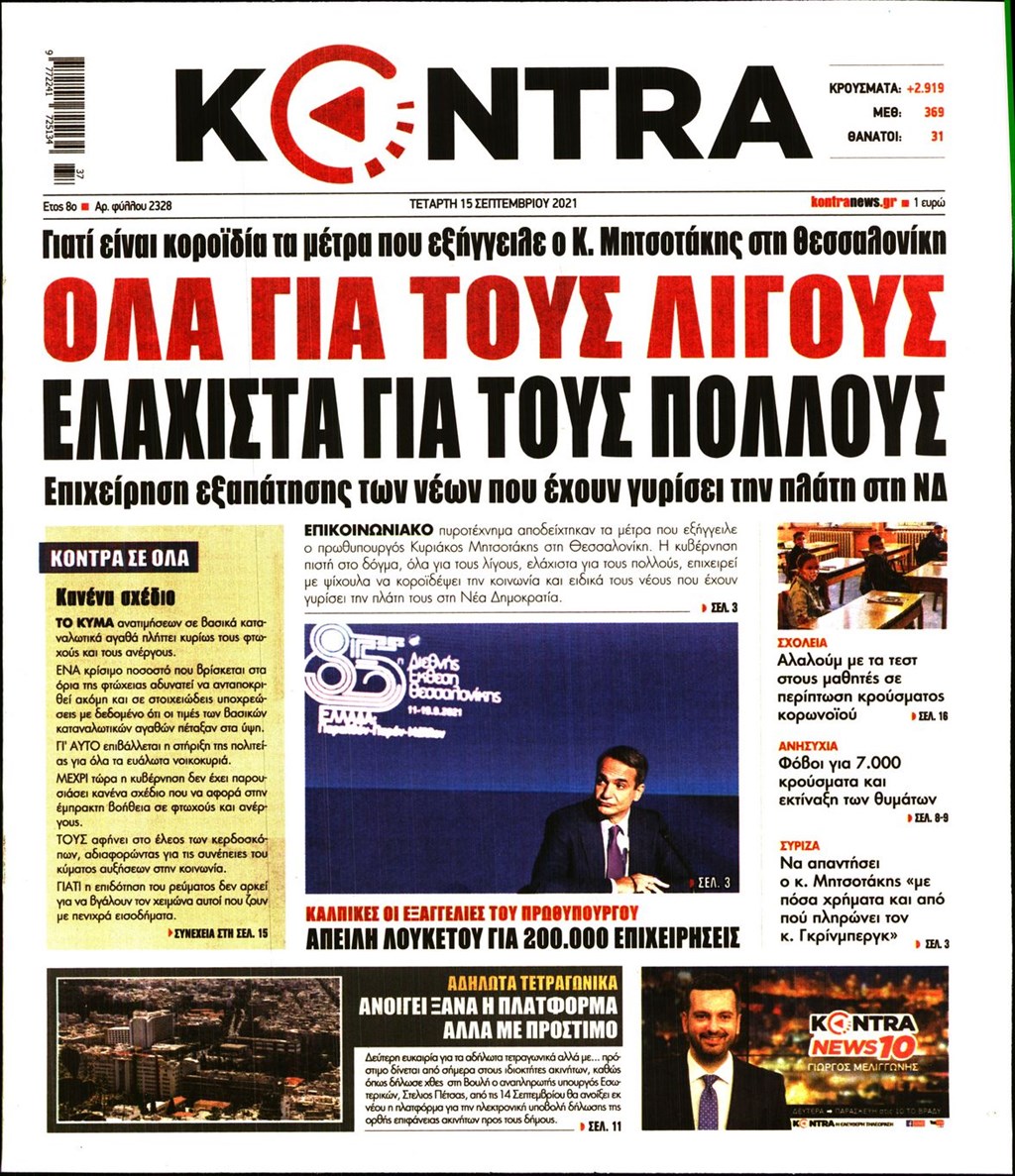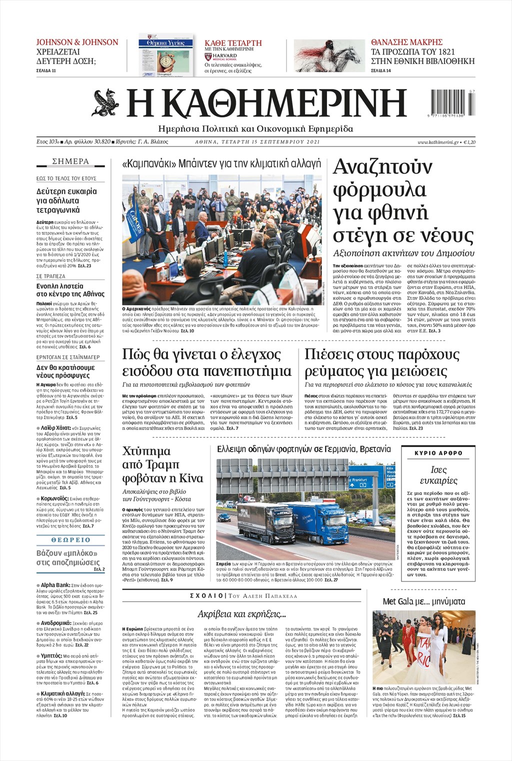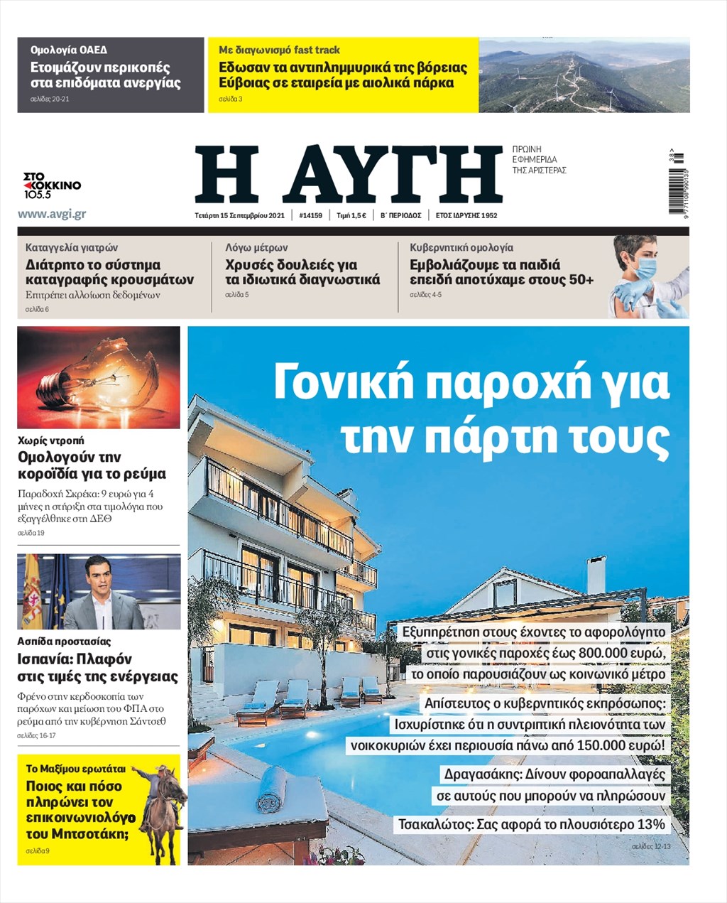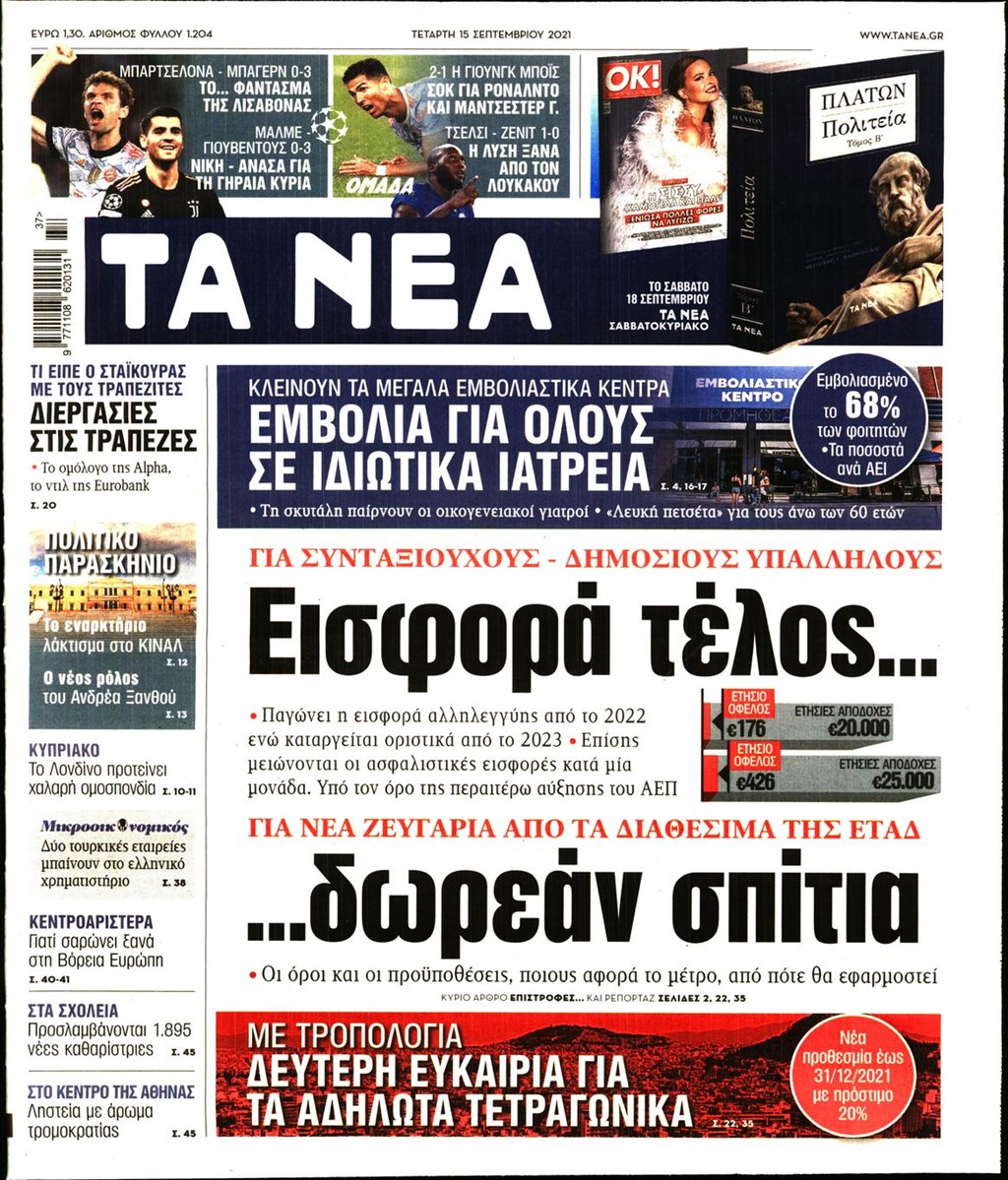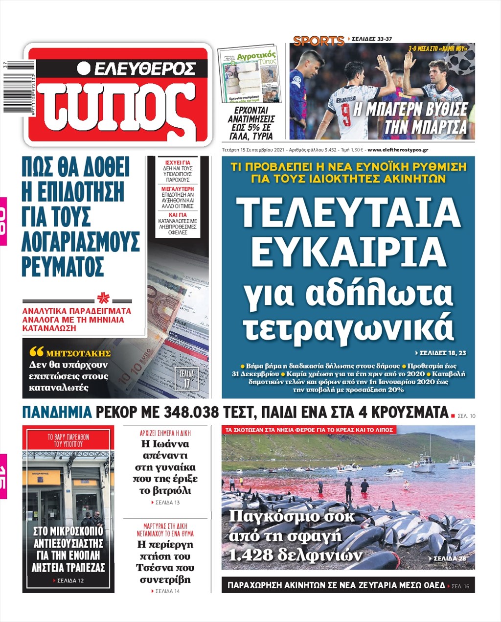 Τα πρωτοσέλιδα των εφημερίδων 15 Σεπτεμβρίου