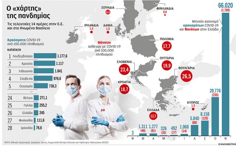 Στη χώρα μας την τελευταία εβδομάδα καταγράφεται μια πιο ξεκάθαρη μείωση της καμπύλης των κρουσμάτων σε σχέση με το προηγούμενο διάστημα στις περισσότερες περιοχές της επικράτειας. Ο αριθμός των ημερήσιων διαγνώσεων τις τελευταίες επτά ημέρες είναι (με βάση τα στοιχεία της Παρασκευής) κατά μέσον όρο στα 1.750, έναντι περίπου 1.950 που ήταν το προηγούμενο επταήμερο. Και την περασμένη εβδομάδα, ωστόσο, η πίεση στο ΕΣΥ και κυρίως στις μονάδες εντατικής COVID ήταν πολύ έντονη (94% πληρότητα στις ΜΕΘ της Θεσσαλονίκης), ενώ κατά μέσον όρο δηλώνονταν 100 θάνατοι ασθενών με COVID-19 ημερησίως. Σε σύγκριση με την υπόλοιπη Ευρώπη, η Ελλάδα βρίσκεται χαμηλά στον αριθμό των κρουσμάτων σε αναλογία πληθυσμού με βάση τις διαγνώσεις των τελευταίων 14 ημερών (245 κρούσματα ανά 100.000 πληθυσμού και 26η θέση στην Ε.Ε. σύμφωνα με τα στοιχεία του Ευρωπαϊκού Κέντρου Ελέγχου και Πρόληψης Νοσημάτων – ECDC), αλλά σχετικά ψηλά στους θανάτους: 11η θέση με 12,7 θανάτους ανά 100.000 πληθυσμού τις τελευταίες 14 ημέρες.