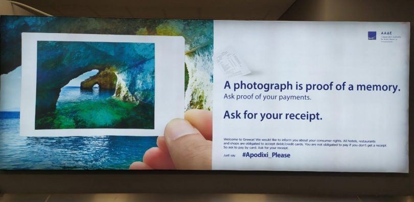 «Μια φωτογραφία είναι απόδειξη μιας ανάμνησης. Ζητήστε απόδειξη για τις πληρωμές σας. Καλωσορίσατε στην Ελλάδα! Θέλουμε να σας ενημερώσουμε για τα δικαιώματά σας ως καταναλωτές. Όλα τα ξενοδοχεία, εστιατόρια και καταστήματα είναι υποχρεωμένα να δέχονται χρεωστικές/πιστωτικές κάρτες. Δεν είστε υποχρεωμένοι να πληρώσετε εάν δεν πάρετε απόδειξη. Συνεπώς, ζητήστε να πληρώσετε με κάρτα. Ζητήστε την απόδειξή σας. Απλά πείτε #Apodixi_Please».
